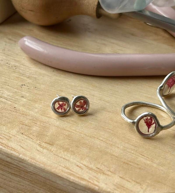 Handmade sterling silver studs made with UV resin and pressed flowers.