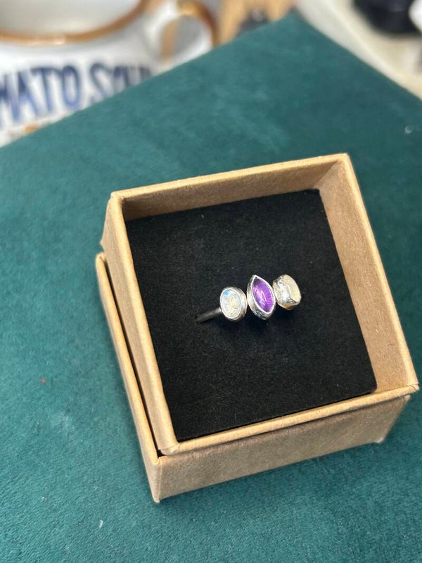 Handmade sterling silver tiara ring using three beautiful stones, Two moonstones full of blue shine and a gorgeous marquise amethyst in the centre✨🔮