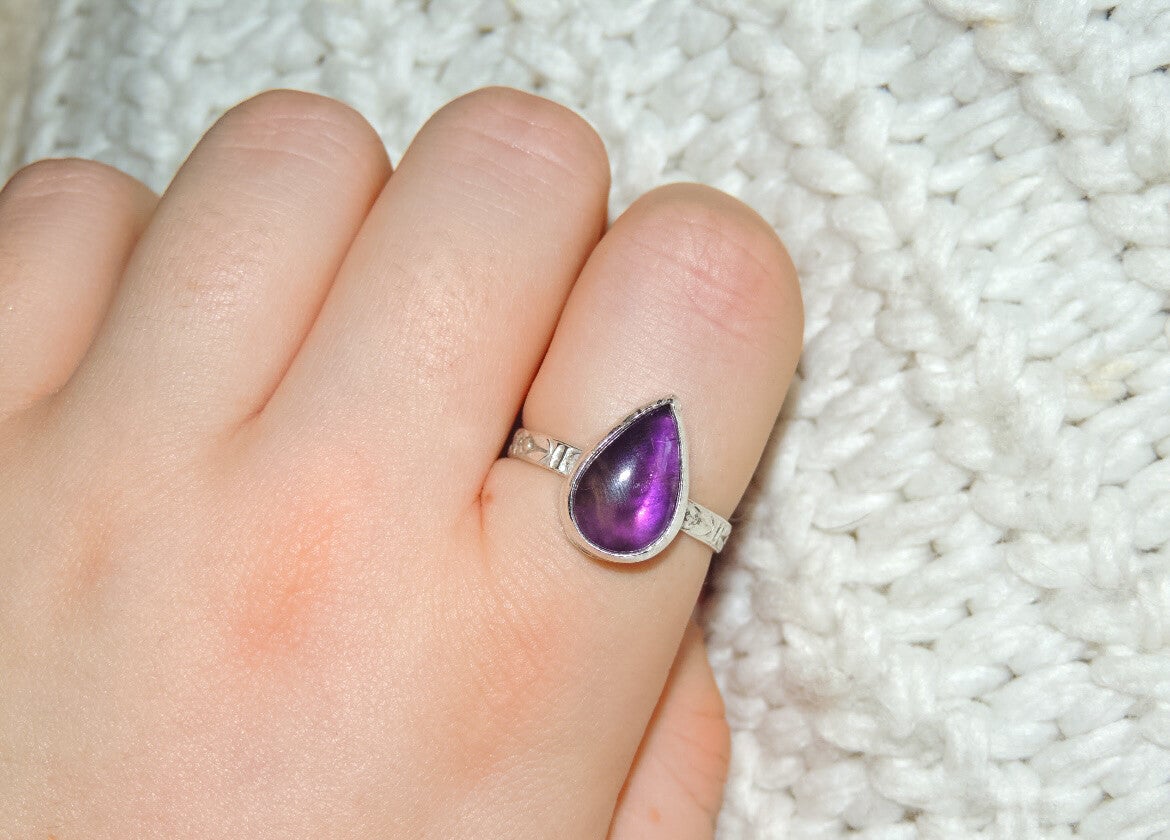 Handmade sterling silver ring made with a pear shaped amethyst with floral gallery wire✨🌸