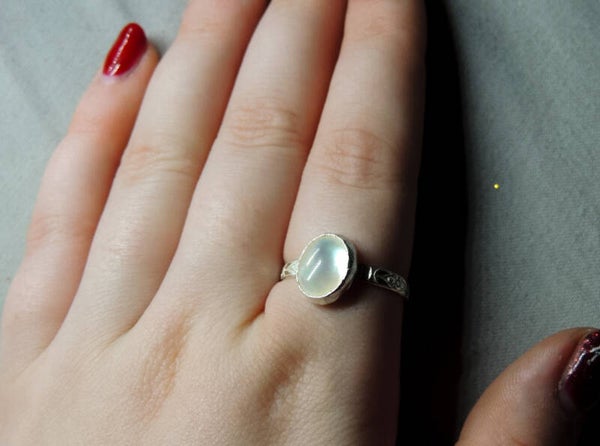 Handmade sterling silver ring made with a mother of pearl stone with a floral gallery wire band✨🌸