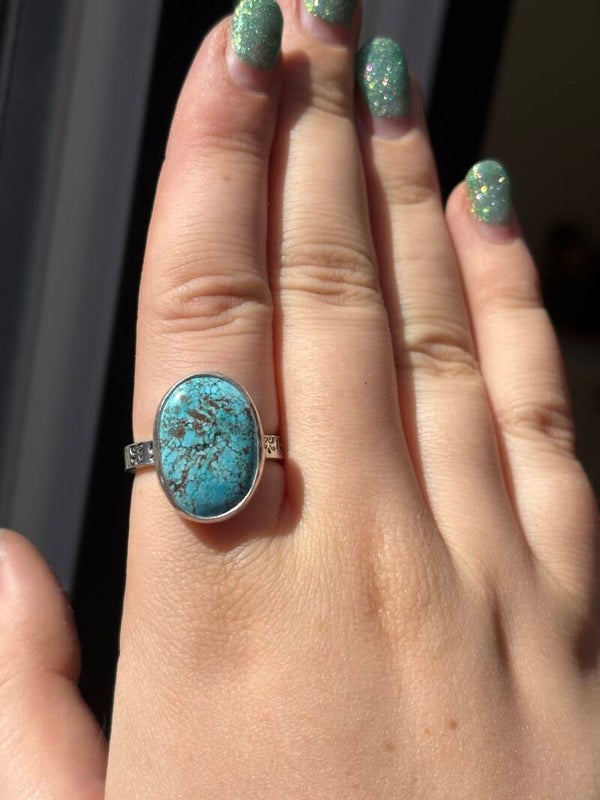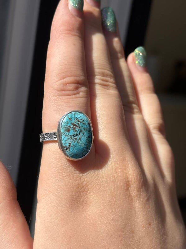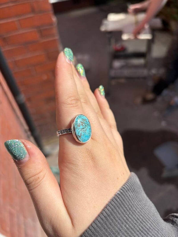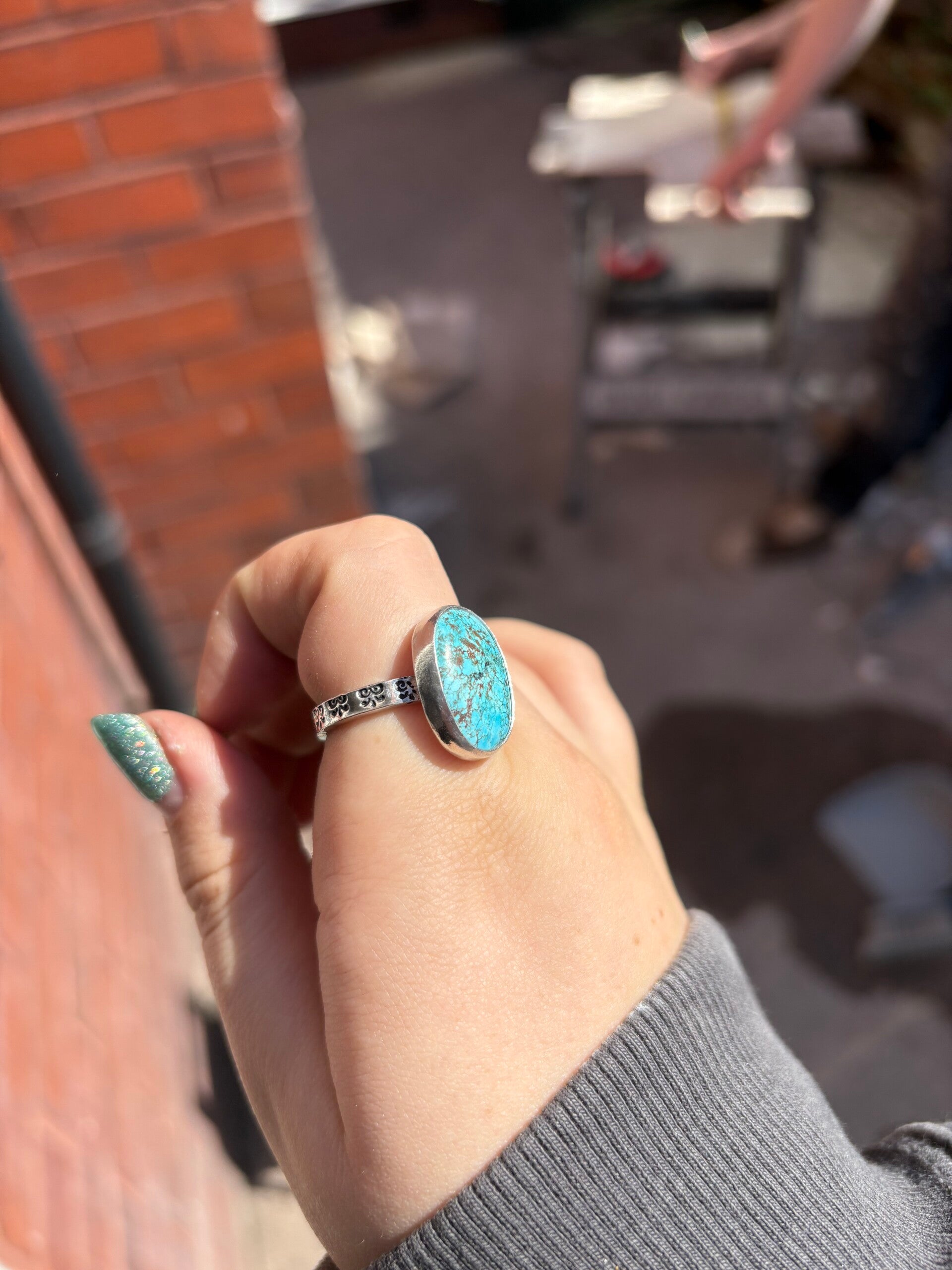Handmade sterling silver ring by me made with a gorgeous turquoise stone and handstamped all the way round the ring band⨠Size P