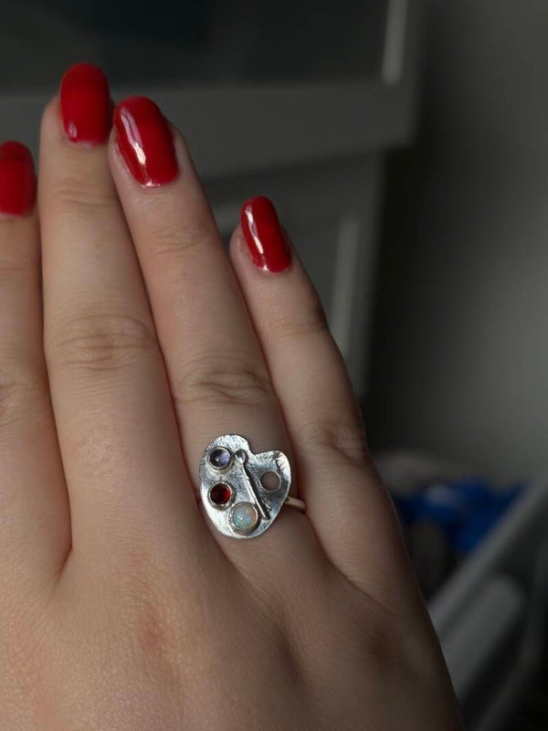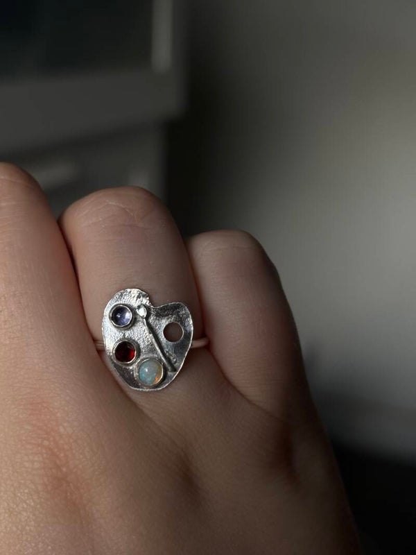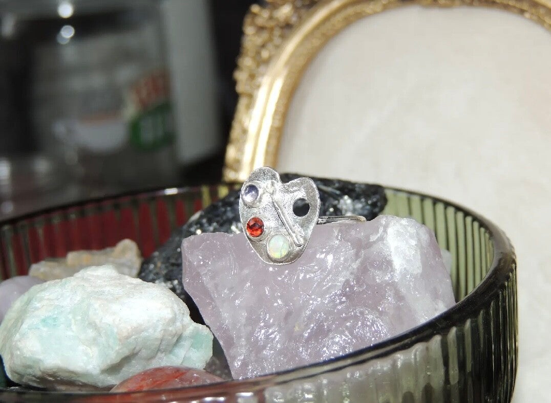This beautiful one of a kind handmade piece is made with sterling silver and three stones including: Garnet, Iolite and a beautiful opal✨🎨Size N🔮