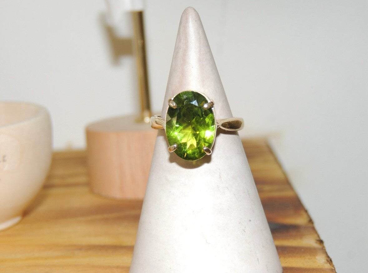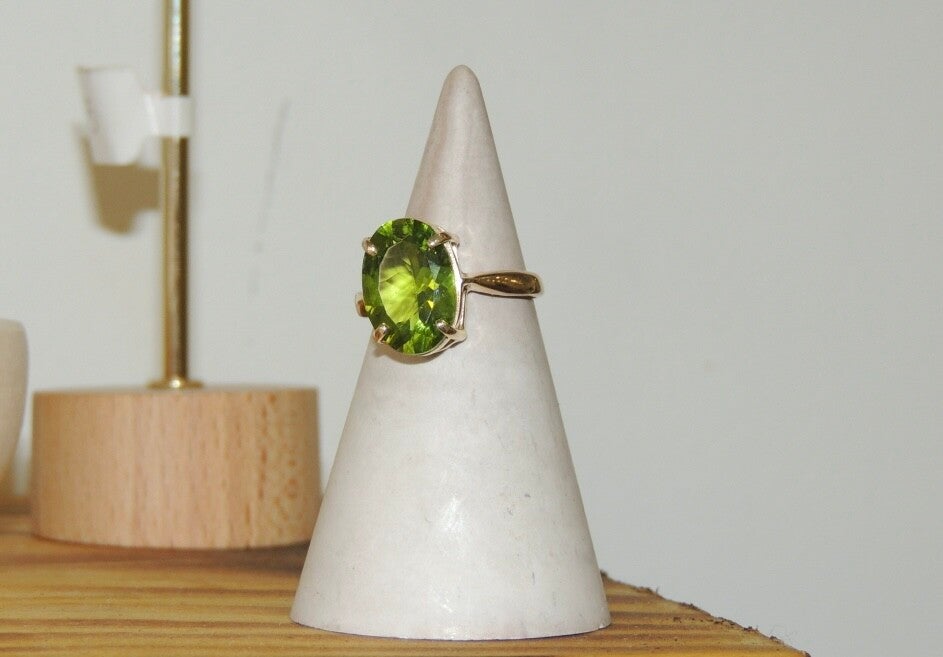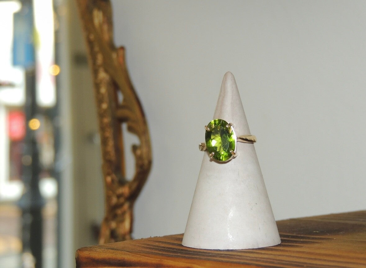 Handmade in 9ct gold, this ring features a beautiful peridot set in a clean, timeless design. Simple, elegant, and effortlessly wearable. UK RING SIZE - N1/2