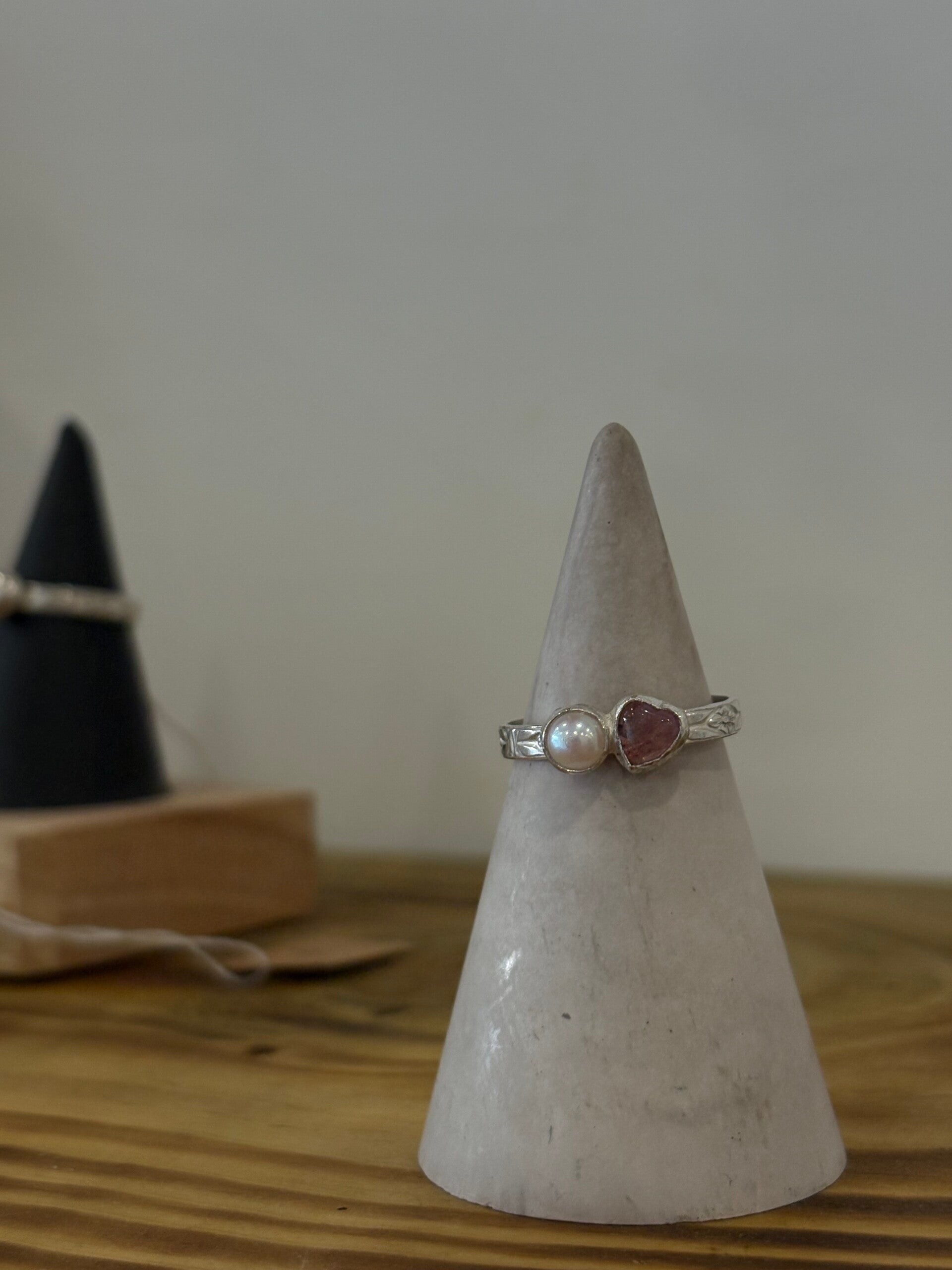Handmade sterling silver ring made with a saltwater cultured pearl and a heart shaped pink tourmaline on a floral textured band!!! Uk ring Size O 💕❤️