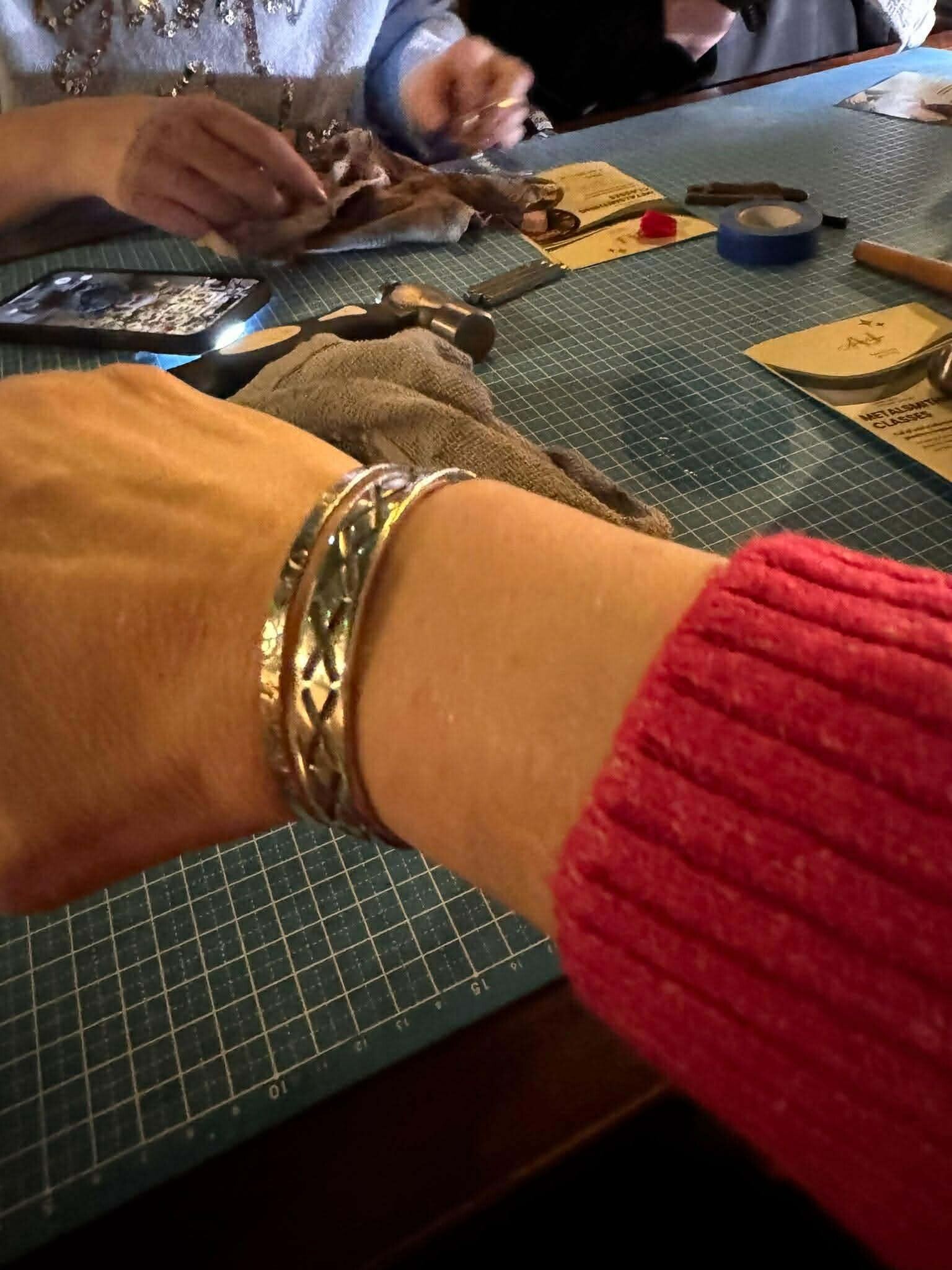 Make your own sterling silver handmade cuff bangle! using different silversmithing techniques such as hammering detailing and metal stamping in this fun experience and leave with a beautiful one of a kind cuff bangle!🔮
